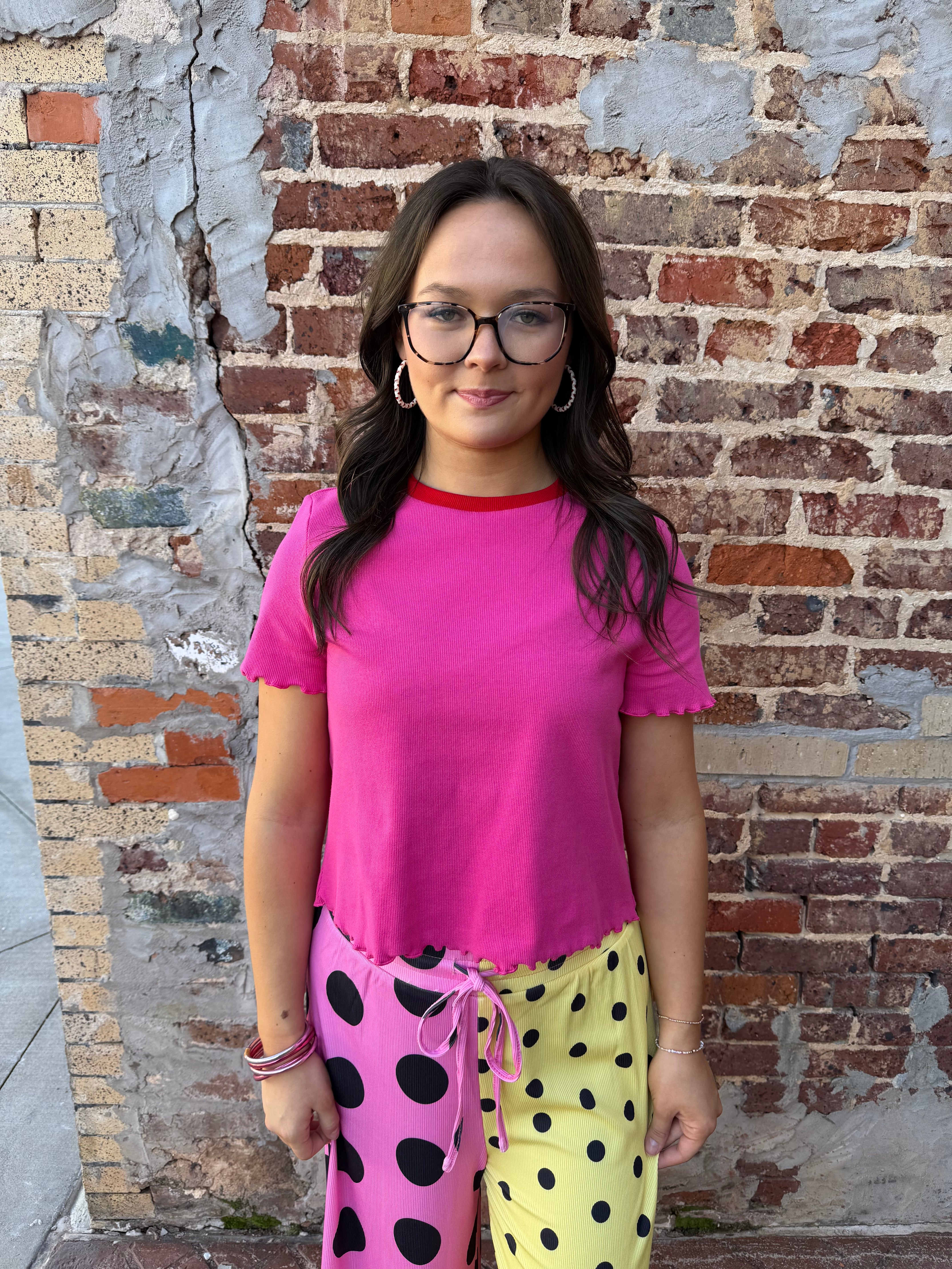 The Cherry Pop Ringer Tee features a bold hot pink body with a contrast red neckline and subtle lettuce hems for that effortless, vintage-inspired vibe. It’s lightweight, soft, and easy to tuck, layer, or wear loose.