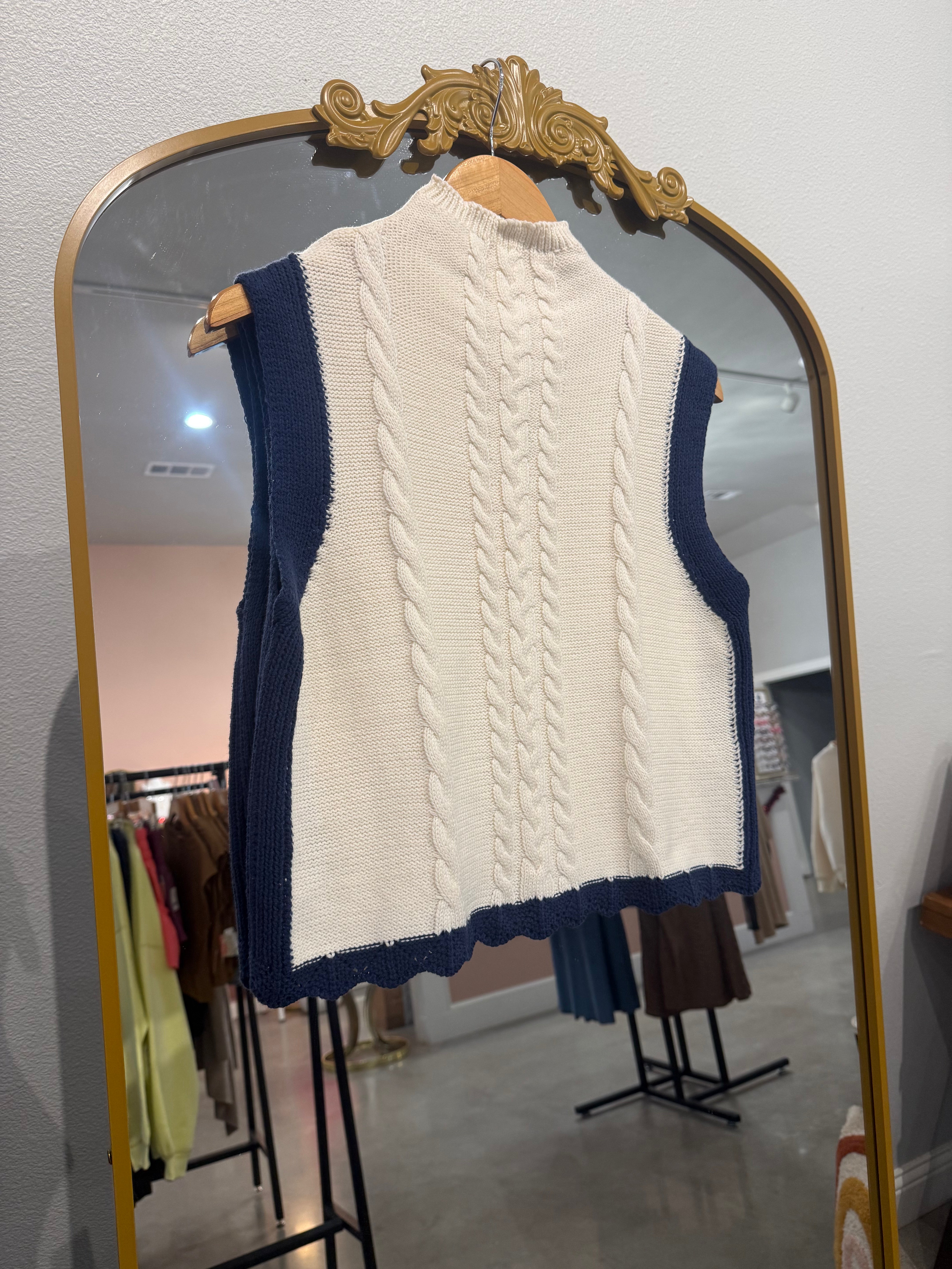 Classic with a cool-girl twist.  This sleeveless cable-knit vest features a creamy ivory body with bold navy trim for that timeless, coastal-prep vibe. Soft and structured with a slightly boxy fit, it’s perfect worn solo or layered over a button-down. Dress it up with trousers or keep it casual with denim—either way, it’s effortlessly polished and endlessly wearable.