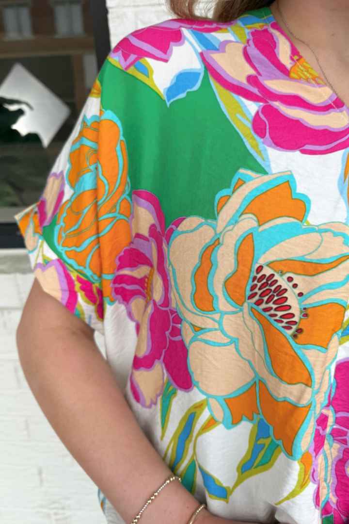 The Layla Blouse features a relaxed drop shoulder design and a flattering V neckline, adorned with a vibrant multi-color floral print. Crafted from lightweight fabric, it offers breathable comfort perfect for warm days or layering. This blouse effortlessly combines style and ease, making it a versatile addition to your wardrobe.