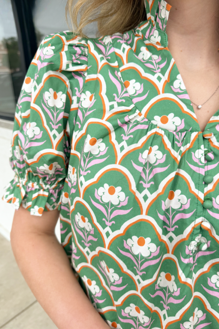 Elevate your wardrobe with our Juliet Blouse, adorned with a delicate floral scallop motif. The elasticated ruffle sleeves create a flattering puff silhouette. Secured with elegant button closures, this lightweight, non-sheer woven top offers both comfort and style.