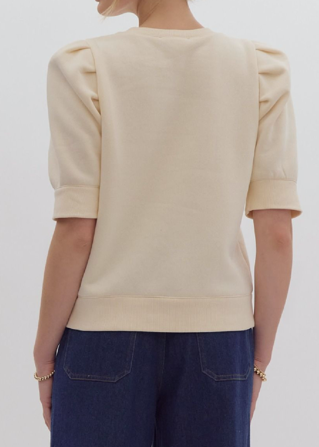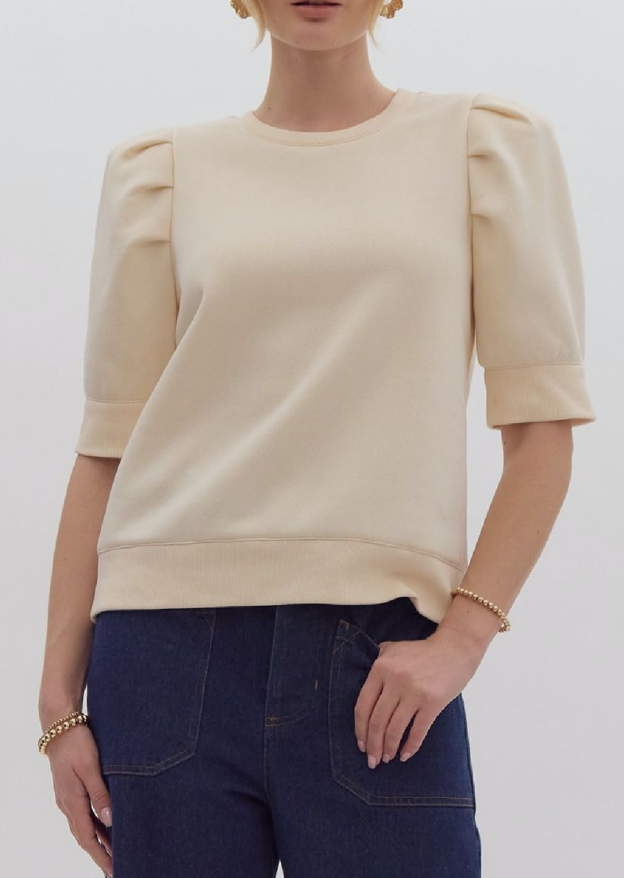 Solid crewneck top has a puff sleeve and ribbed cuffing at the hemline and at the end of the short sleeves. Top has a sweatshirt feel with a dressed up look. Pair with denim to wear everyday or wear with a dressier pant or skirt for a workday look.