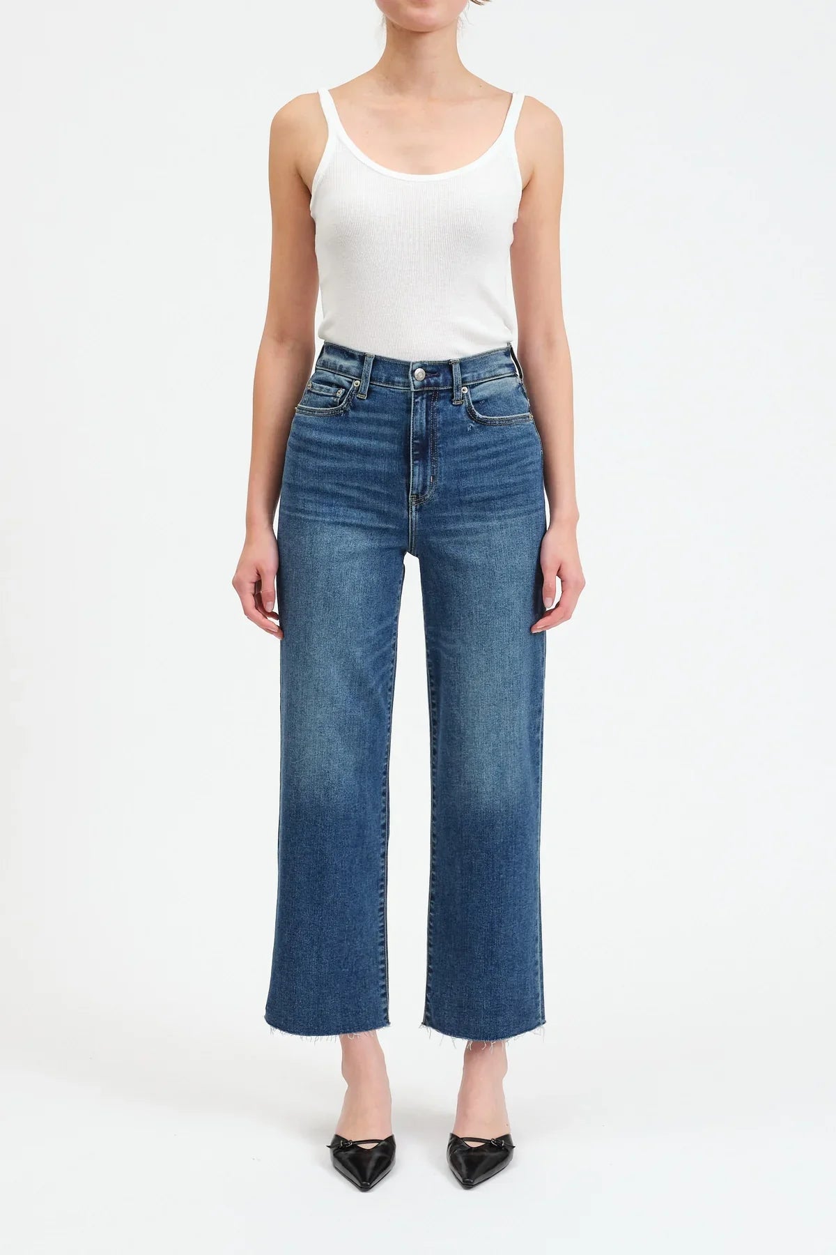 In an easy wide leg, this waist defining high rise features a slightly faded dark blue wash with a scissor cut hemline. Constructed in our Hug denim, has flattering stretch while still keeping the vintage inspired wide leg fit.