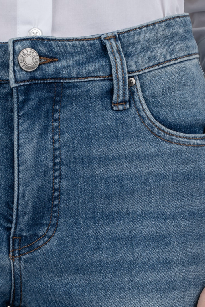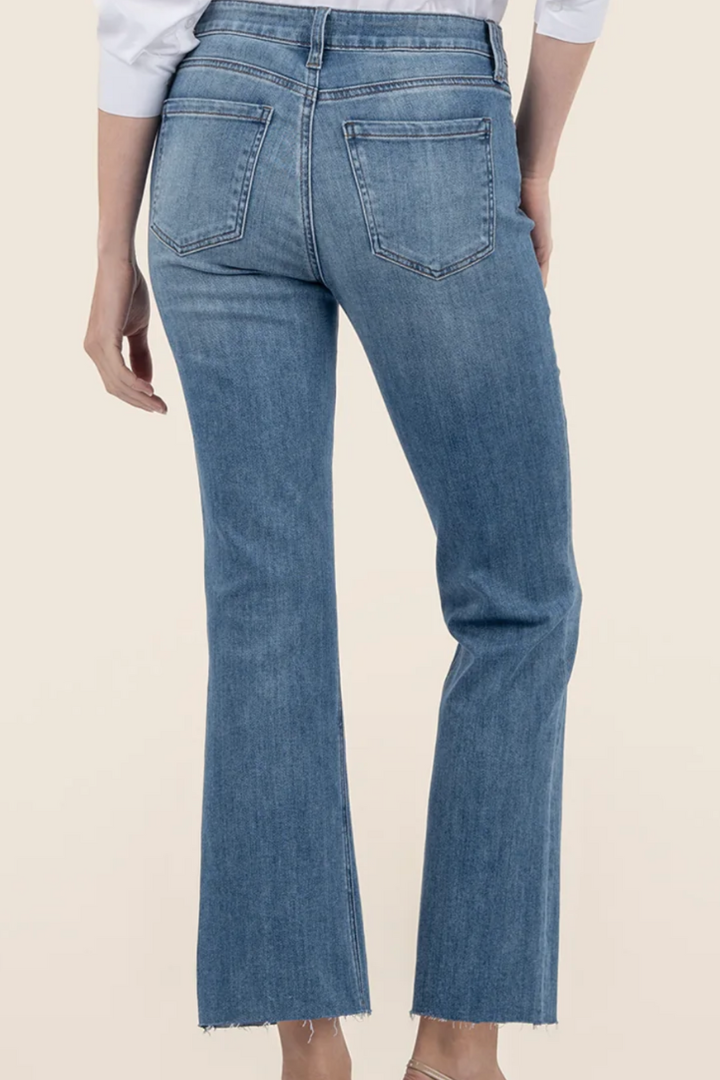 • Classic and casual-chic, these ankle-cropped flares jeans are made from premium stretch denim and faded for a lived-in look with our fab ab front pockets that smooth and add comfort.